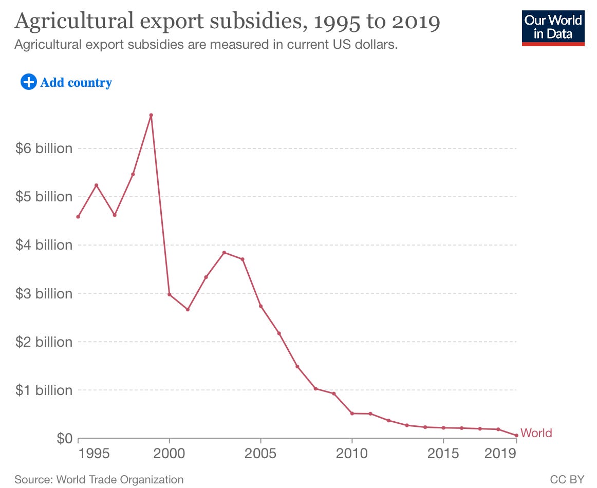 Export subsidies aren’t the sexiest of topics, but they are (were) significant in global development. They allowed largely US and EU based exporters to undercut farmers in developing countries, making it difficult for those farmers to make a living, and driving down the global cost of food. And they were funded by the tax payers in the US and EU countries! More details can be found here.