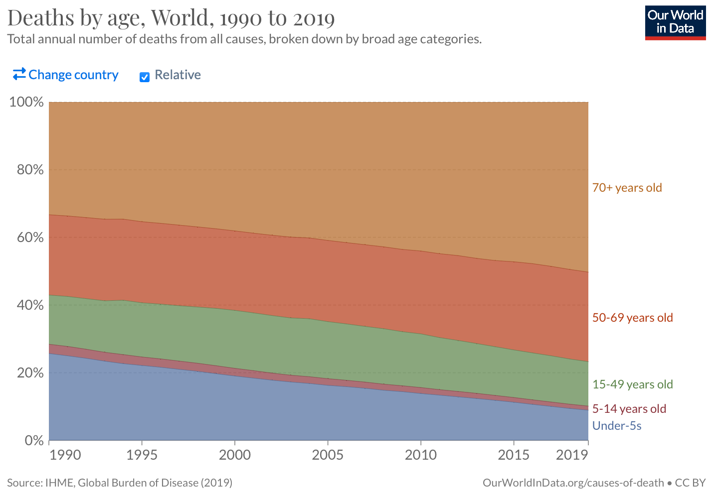 The rest of the graph is good news as well - people are living longer (which on the whole means healthier) lives around the world.