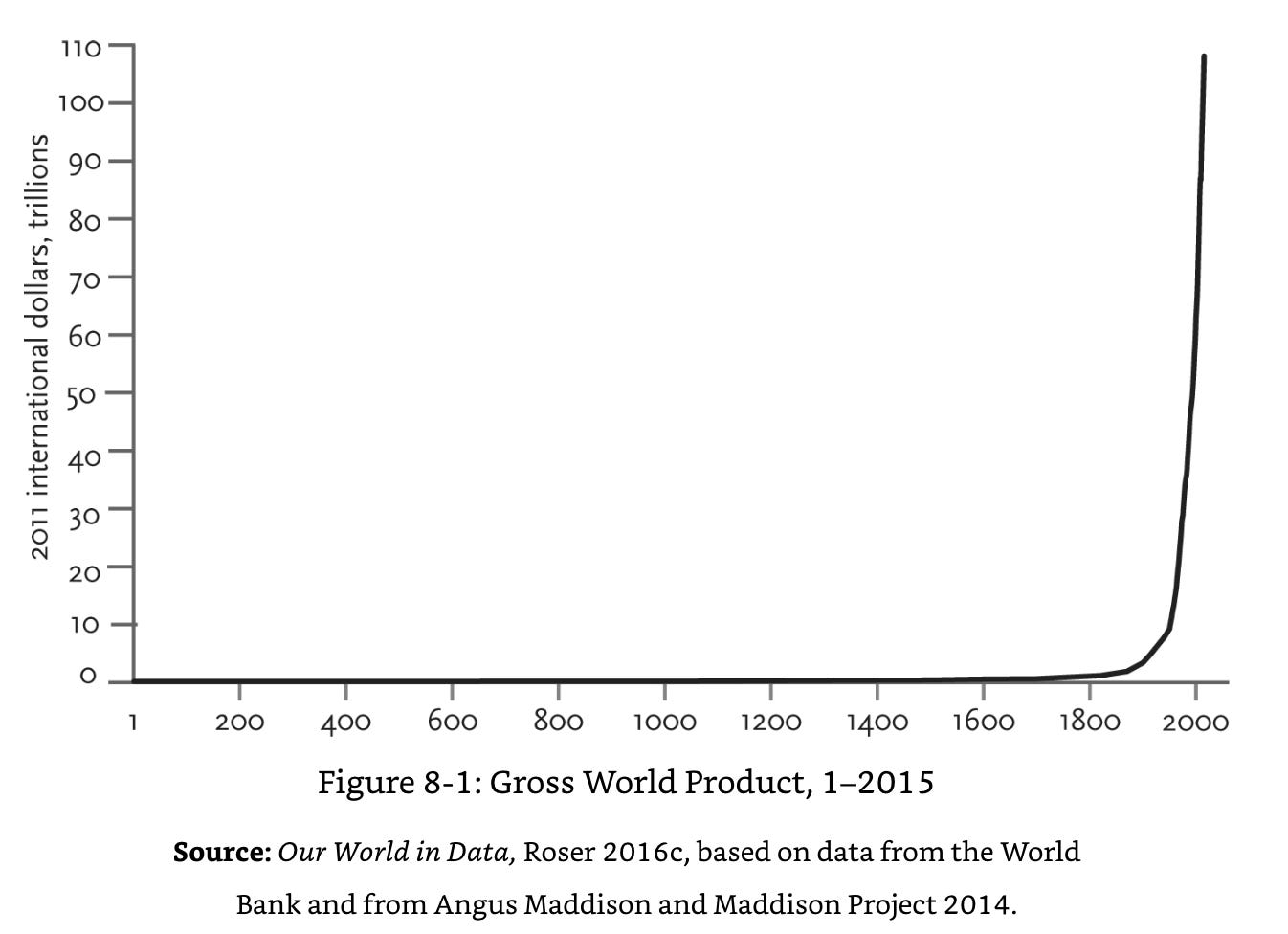 Of all the graphs I’ve come across so far, this one perhaps has the biggest ‘wow’ factor. The Gross World Product is like GDP, but for the whole world, and relative to the buying power of the dollar at a fixed period in time. The insane increase in wealth (and wealth is indeed created) is the driver behind almost all the other improvements we’ve seen and will see. Without the efficiencies and scale afforded by modern technologies and systems we’d still be struggling along trying to produce, hunt or gather the calories we need to survive.