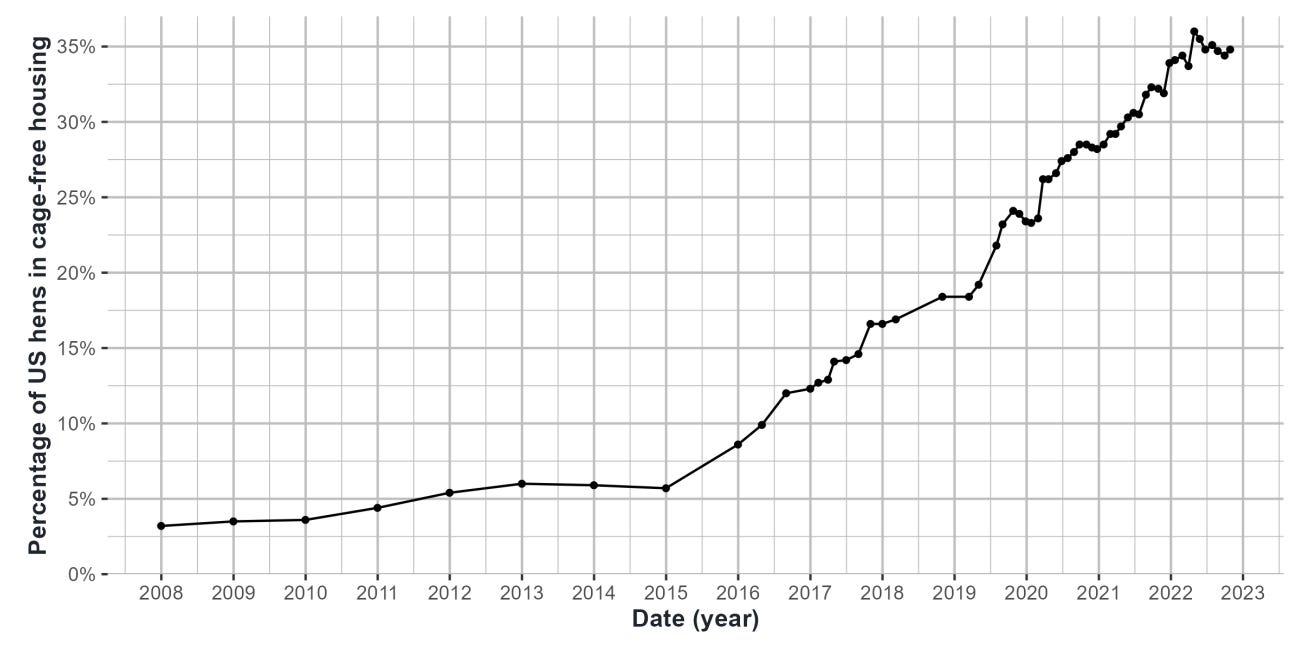 But under the general theme of ‘bad but better’, look at the progress that’s been made with cage-free hens in the US, increasing from almost a standing start in 2008 to over 35%.